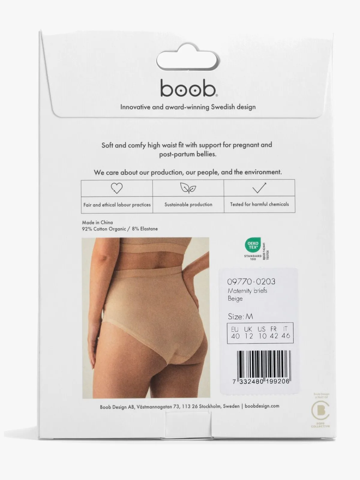 – 92 % økologisk bomuld, 8 % elastan.