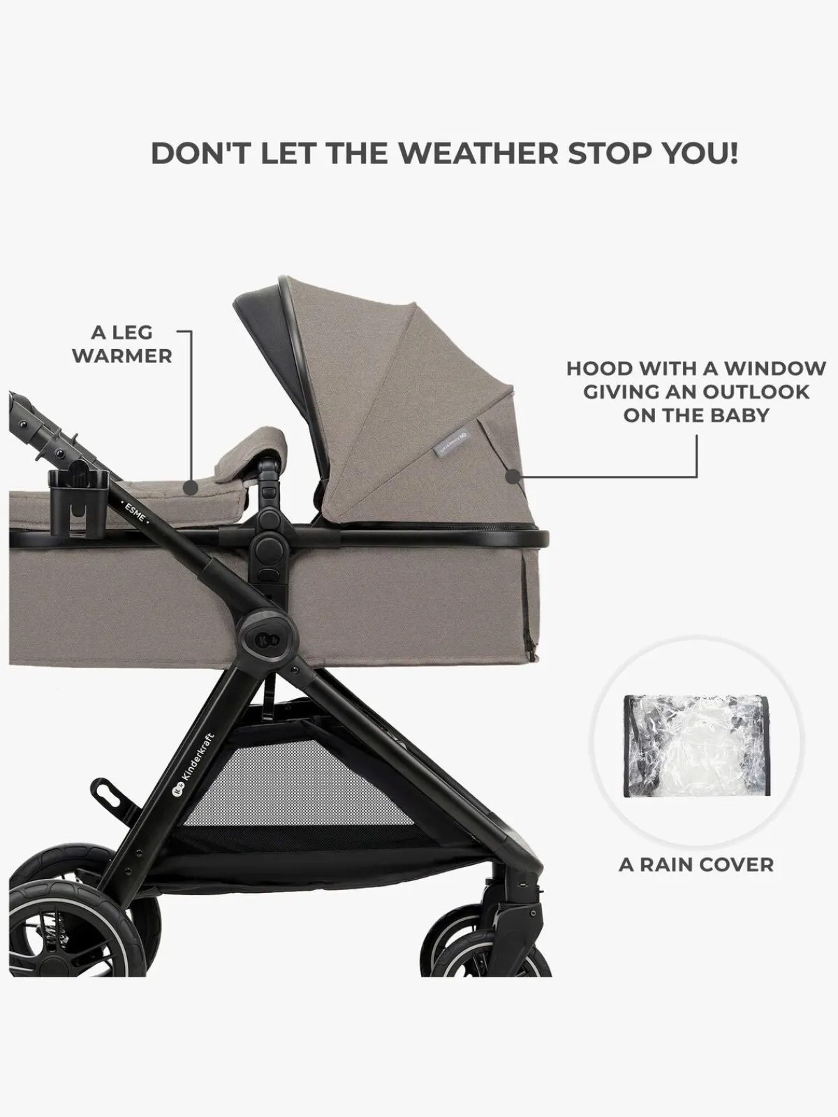 – Inkluderer: kopholder, kørepose, regnslag, pusletaske, adaptere, babyautostol.