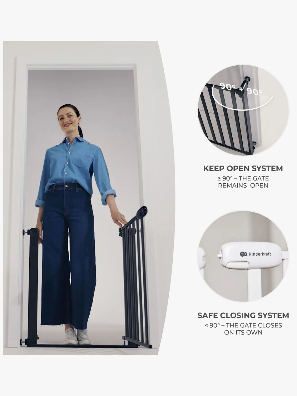 – Forbliver åben ved 90 grader.