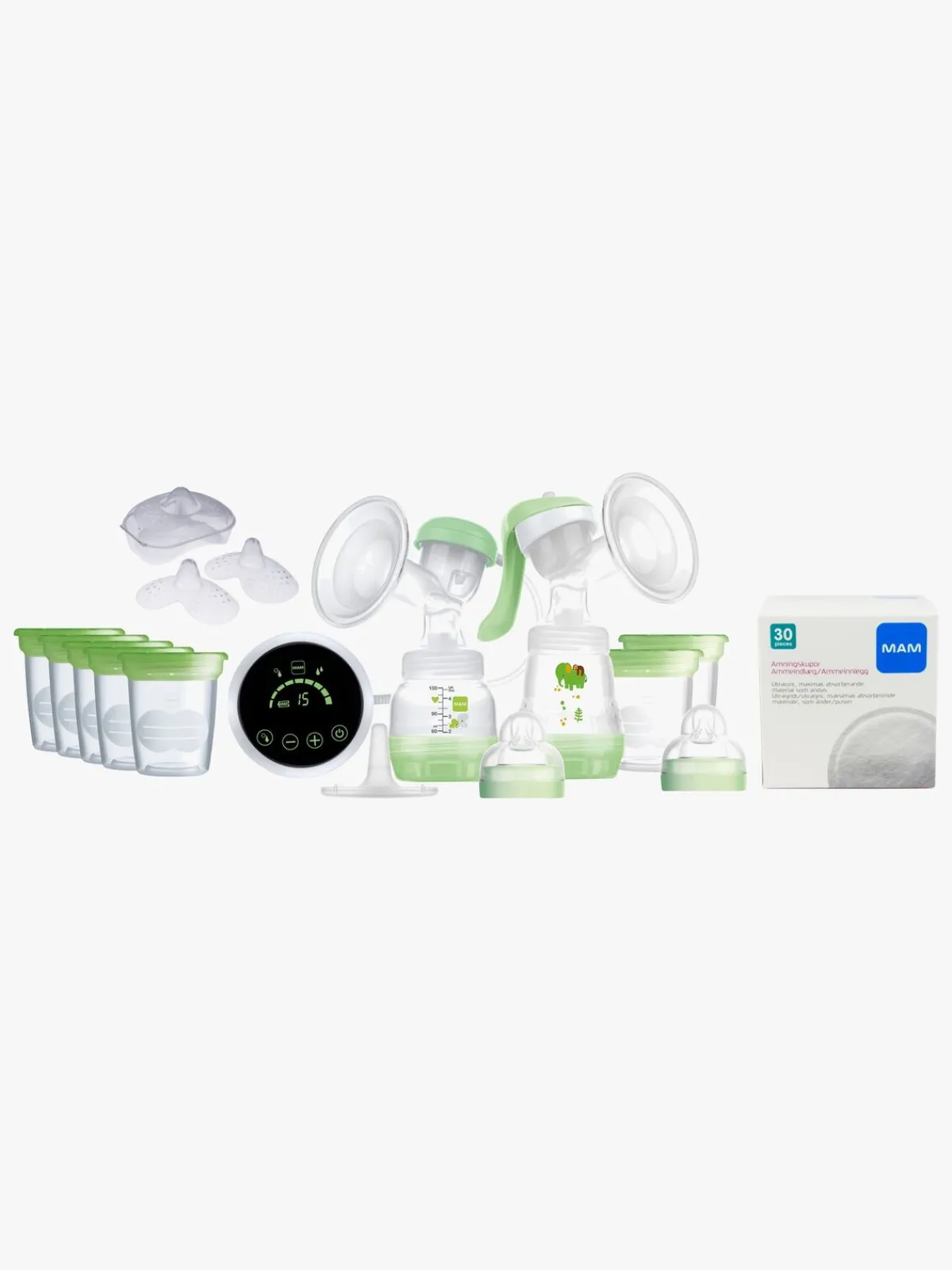 Vil du bruge den manuelle brystpumpe er det let at skifte. Brystpumpen er kompatibel med MAM-sutteflasker. To Easy Start-sutteflasker og syv opbevaringsbokse fra MAM medfølger. Du kan pumpe direkte ned i sutteflasken eller i boksen for at opbevare mælk på køl eller frys. Alle dele af pumpen kan steriliseres.