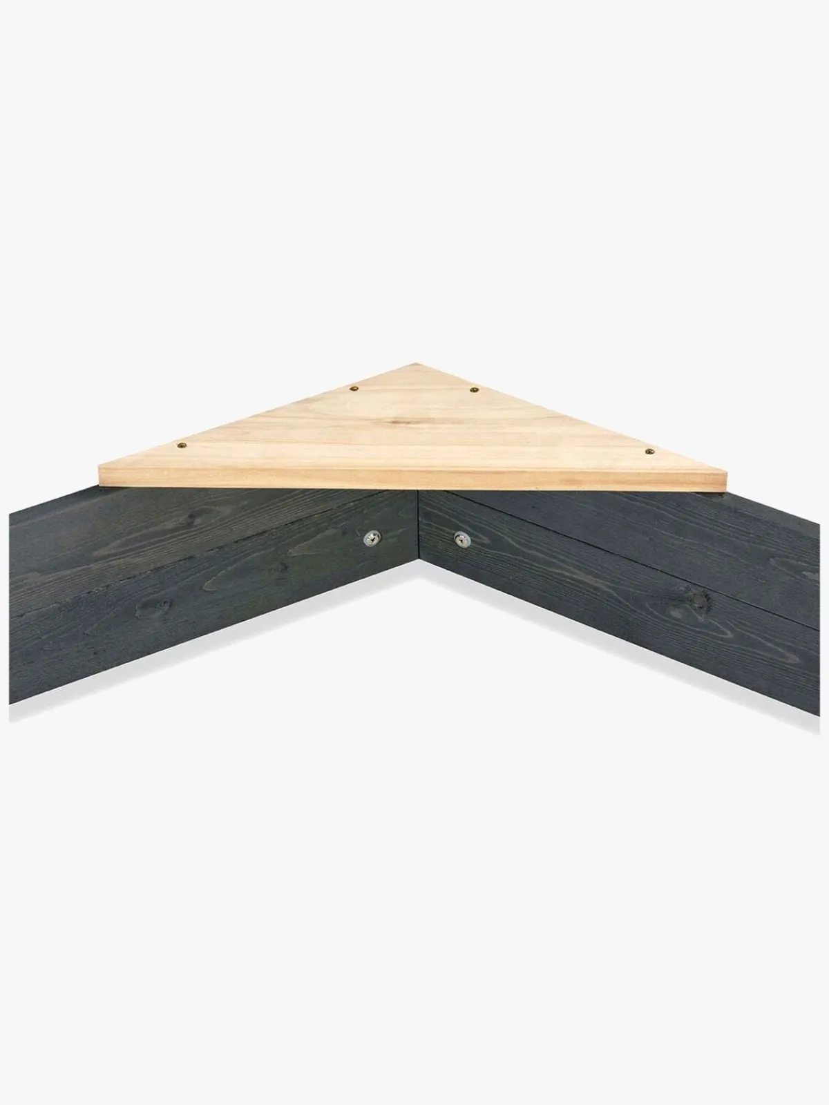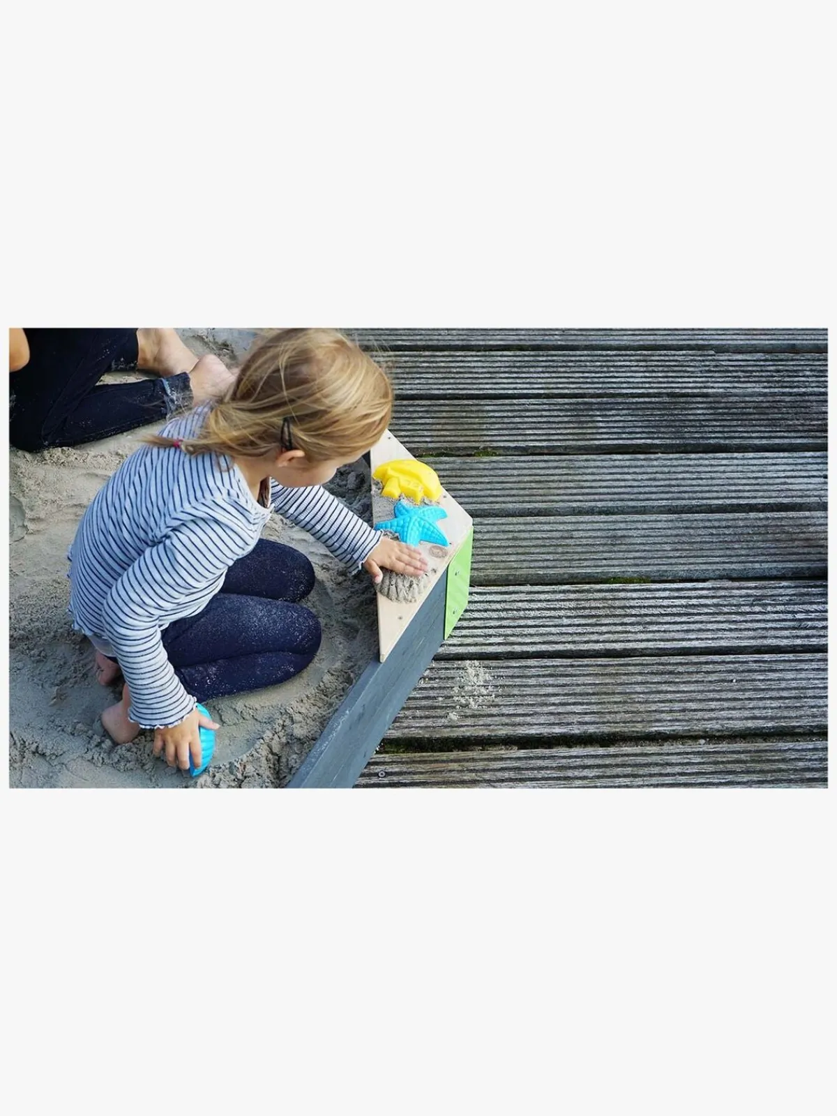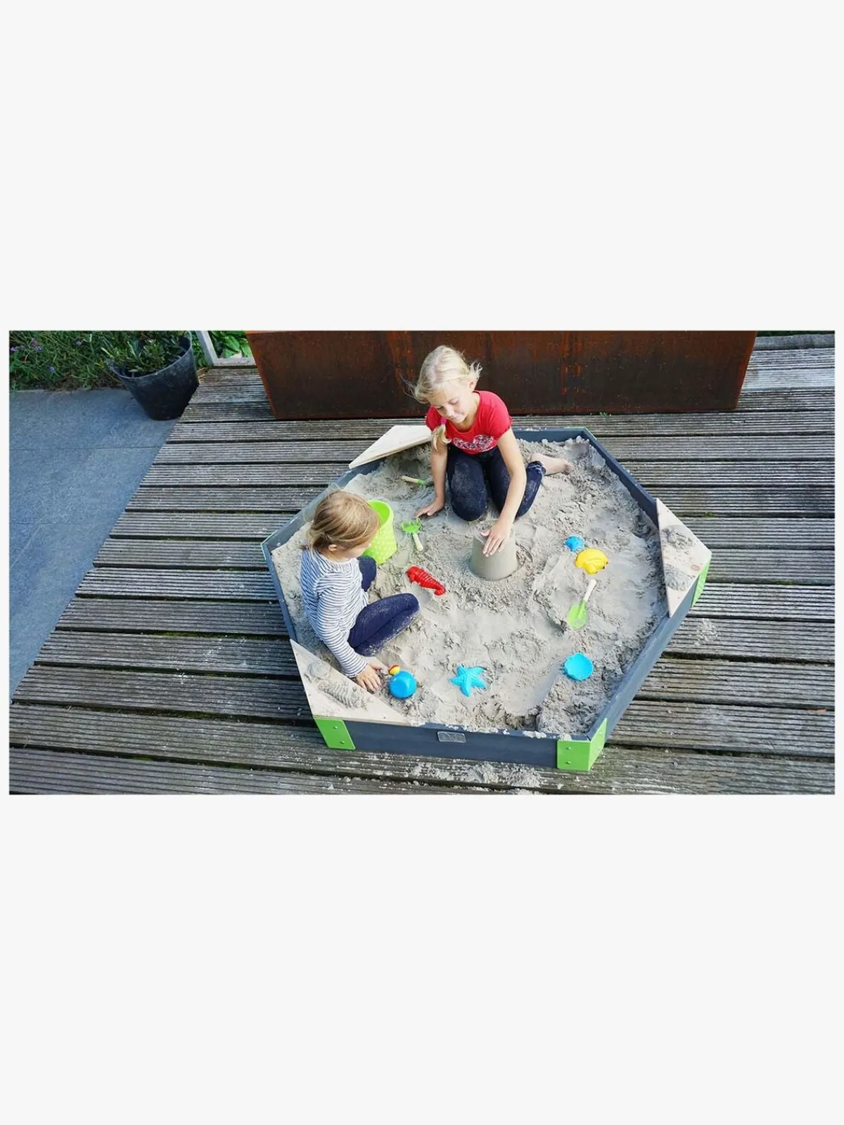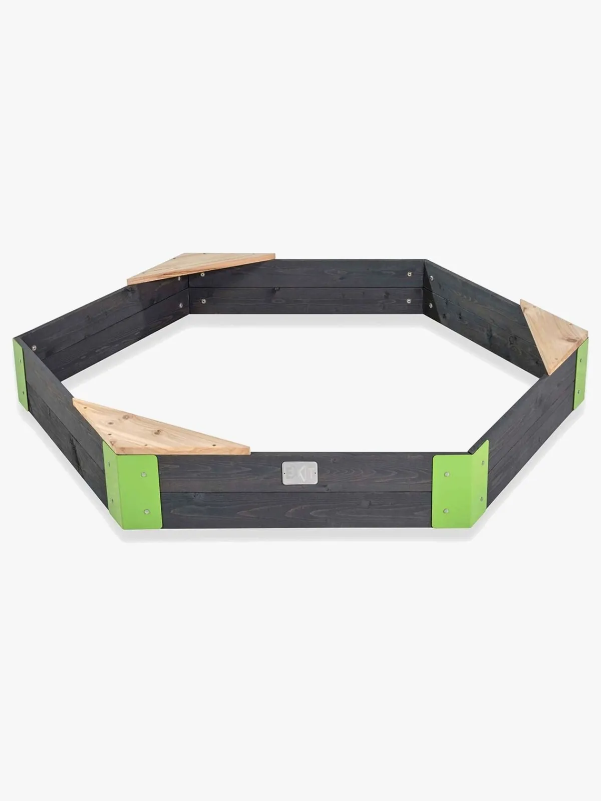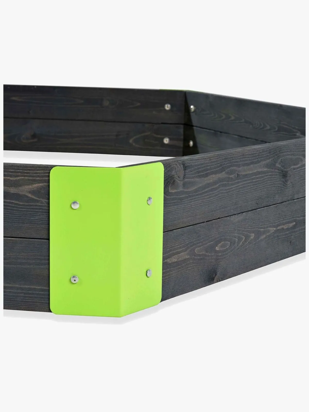 Aksent-sandkasserne fra EXIT Toys er lette at montere. Metalbeslag fastgøres i de forborede huller i hjørnerne, hvilket gør, at sandkassen er meget stabil. Hjørnerne er malet i en tydelig grøn farve, der i kombination med det gråfarvede træ, giver sandkasserne et flot og moderne udseende. Denne trætype er fri fra splinter og er naturligt modstandsdygtigt overfor vejrpåvirkning som regn og vind. Du behøver ikke at behandle sandkassen inden brug, børn kan lege sikkert i den, så snart den er færdigmonteret.