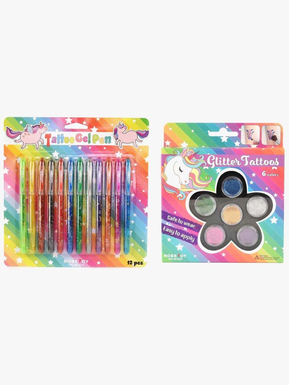 Tatoveringssæt fra Robetoy med skønne glimmerfarver og 12 glimmertatoveringspenne. Brug din fantasi og tegn direkte på huden. Tatoveringerne er lette at få væk med sæbe og vand.