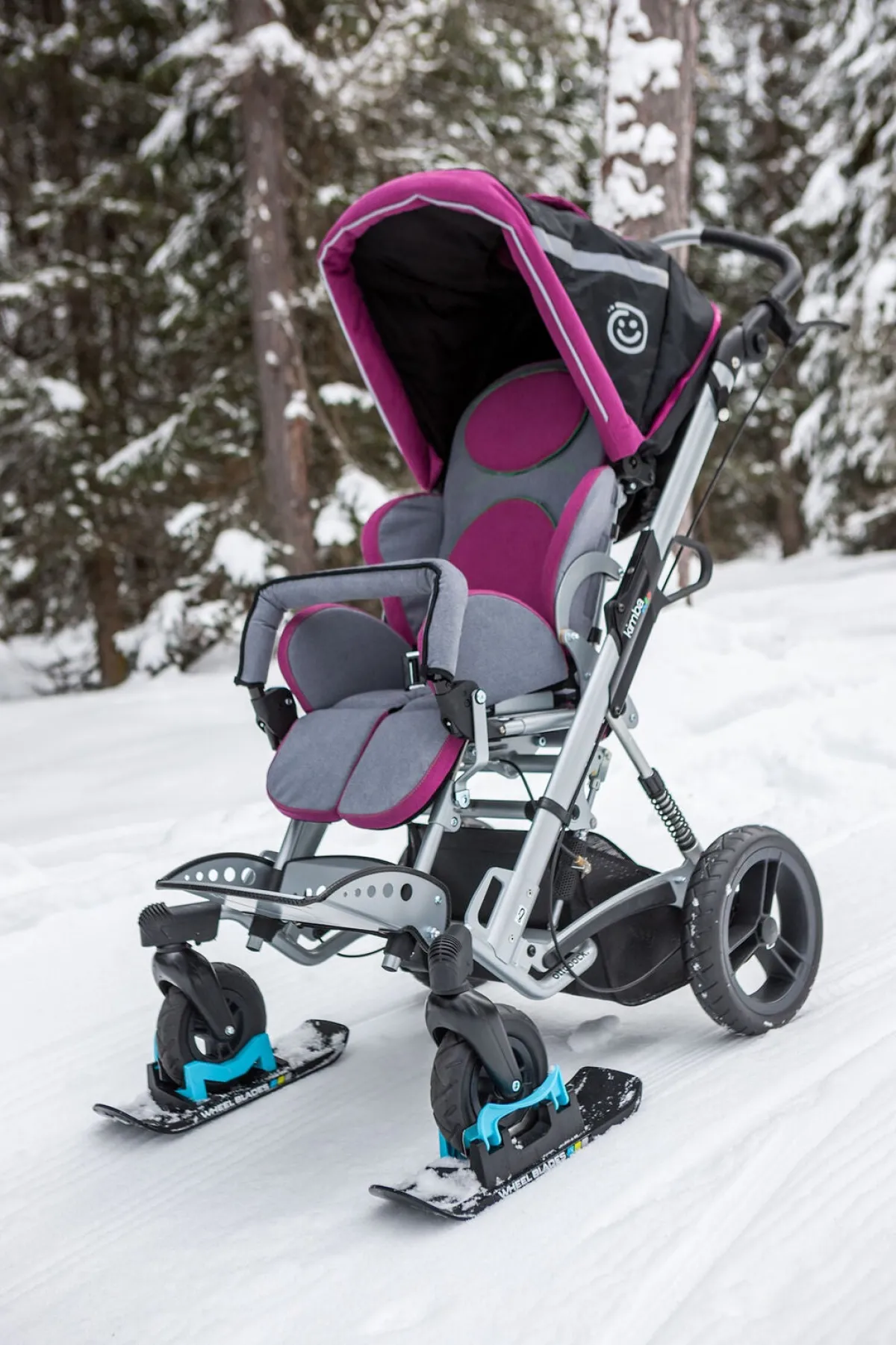 Takket være det patenterede hurtigbeslag er det let og hurtigt at skifte fra hjul til ski. Wheelblades brede overflade gør, at vægten fordeler sig optimalt på underlaget og forhindrer forhjulene i at synke ned i sneen.